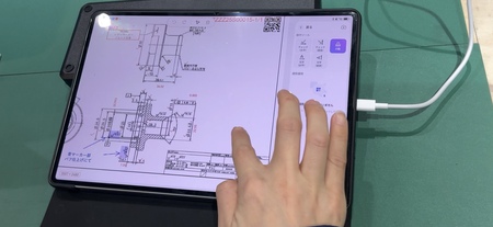 当社では、基幹システムで製品の受け入れや仕分け作業等の管理が効率よくできるように、案件ごとにQRコードをつけていました。今回、開発した新機能では、タブレットに搭載のカメラでこのQRコードを読み取ると、タブレット上に検査図面が表示されます。画面を指でタップしレ点チェックを入れたり、 実測値を打ち込むことができるようになっています。