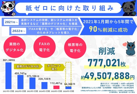 当社では〈紙ゼロ・ルーティンゼロ・残業ゼロ〉を掲げ、またDXを推進しています。紙の使用量に関しては、2021年にこの取り組みがスタートして以降、90%の削減に成功しました。