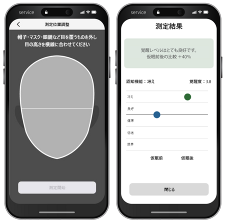 覚醒度計測中の画面イメージ(左)と、仮眠後の効果表示画面(右)