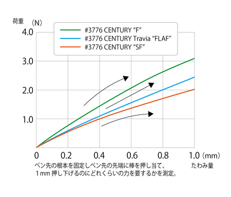 ペン先のしなり傾向を検証・比較してみると、下図のように現行品の#3776 CENTURY “F” よりも軟らかいしなりが得られていることがわかります。(FLAF ペン先は現行ペン先よりも少ない力でペン先がしなっています。)また比較対象の#3776 CENTURY “F”・“ SF” が弓なりのカーブ特性であるのに対し、FLAF ペン先は加えた力に素直に反応してしなる、直線的なカーブ特性なので、筆圧に応じて思った通りに線が変化し、書き味をコントロールしやすいペン先と言えます。寄り添う、繊細で豊かなタッチを実現しました。