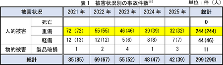 (※3)物的被害(製品破損または拡大被害)があった場合でも人的被害のあったものは、人的被害に区分している。また、人的被害(死亡・重傷・軽傷)が複数同時に発生している場合は、最も重篤な分類で事故件数をカウントし、重複カウントはしていない。