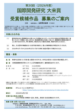 主催:一般財団法人国際開発機構(FASID)第30回国際開発研究大来賞 受賞候補作品の募集について