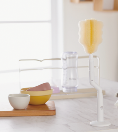 そんな課題を解決するために、ヘッドを長めにすることで底まで届きやすく、回転式にすることで力を加えなくともスピーディーに汚れを落とすことができるほ乳びん洗いスポンジを開発しました。