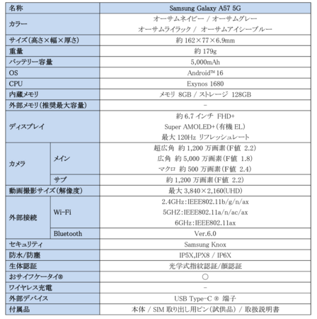<主な仕様:「Samsung Galaxy A57 5G」>
