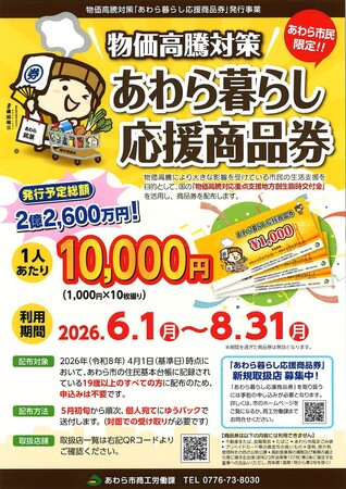 あわら市は、物価高騰の影響を受ける市民生活を支援するため、国の「物価高騰対応重点支援地方創生臨時交付金」を活用し、市内取扱店舗で利用できる『あわら暮らし応援商品券』を発行します。