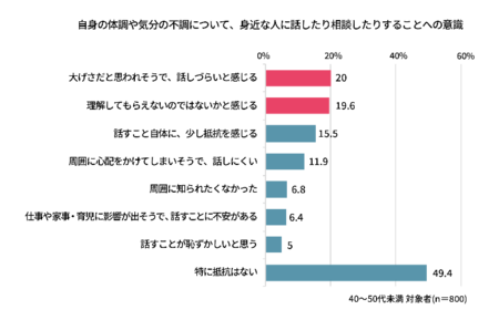 ● 不調を周囲に相談することに対し、大げさだと思われそうで話しづらい」(20.0%)や「理解してもらえないのではないか」(19.6%)という周囲の目を不安視