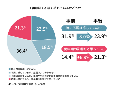 調査の事前・事 後で同一の質問を用いて、自身の体調に対する認識を比較したところ、「特に不調は感じていない」と回答した割合は、調査前の31.9%から調査後には23.9%へと8.0ポイント減少しました。調査を通じて自身の不調と向き合った結果、これまで見過ごしていた自身の不調に気づく変化が見られました。加えて、自身の不調が「更年期の影響だ」と気づく人の割合も調査の事前事後で6.9ポイント増加しました。