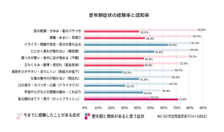 Ⅰ.40〜50代女性の7割が経験する「肌の乾燥・頭痛・不眠」、半数以上が更年期関連不調と認知されず。更年期のサインは身近な不調ほど見逃される