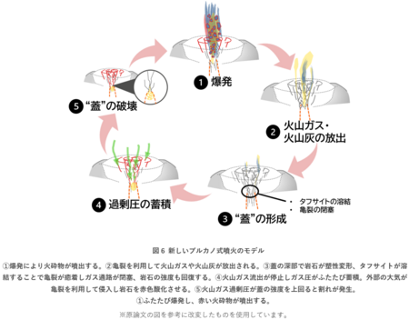 以上のように、浅部と深部で異なる物質的性質をもつ蓋を想定し、亀裂の形成と癒着という素過程を考えることで、爆発が繰り返し起こるメカニズムとそれに伴う噴出物組織の特徴を精緻に説明することができました。
