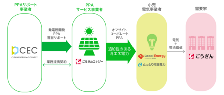 本オフサイトコーポレートPPAサービス(以下、「本サービス」)は、ごうぎんエナジー株式会社が開発した太陽光発電所で発電した電気をローカルエナジー株式会社(代表取締役 加藤 典裕)および株式会社とっとり市民電力(代表取締役 児嶋 太一)が小売電気事業者として、山陰合同銀行の30事業所へ供給します。本サービスの取り組みにあたり、ごうぎんエナジー株式会社は、株式会社クリーンエナジーコネクト(代表取締役 内田 鉄平)との業務提携契約により、同社から太陽光発電所の開発、電力料金の精算、関係者間の調整などのサポートを受けております。