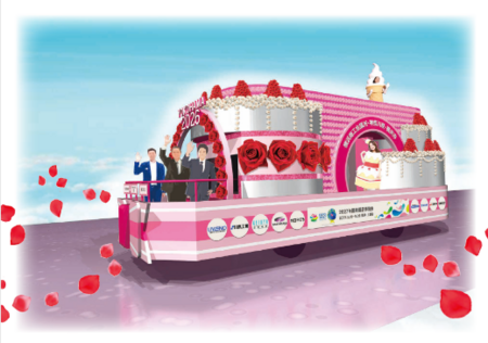 前回に引き続き、「GREEN×EXPO 2027(横浜市、GREEN×EXPO協会)」「ありあけ」「崎陽軒」に加え、新たに「横浜フィナンシャルグループ」が参加し、「進め、ヨコハマスイーツマジック!」をテーマに、赤と白のバラでショートケーキに見立てた主催者フロート(横浜商工会議所・神奈川県・横浜市)を合わせて計5台のフロートがパレードを盛り上げます!