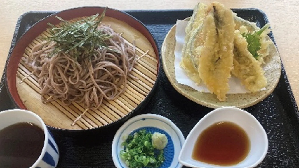 ※大田の大あなごの天ぷらがついた、三瓶のそば粉を使用したざる蕎麦。