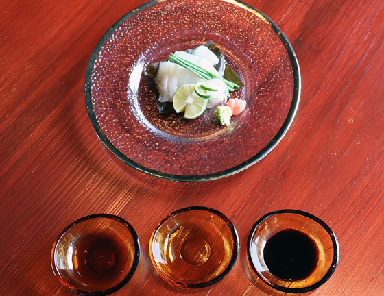 皿に昆布を敷き、その上に大ぶりな刺身にした身とエンガワをのせ、芽葱、白葱、酢橘、山葵、紅葉卸を添え、出汁醤油、透明醤油、自家製ポン酢の3種の特製醤油が出てくるのが面白いです。