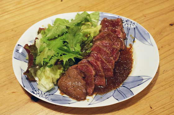 それを、食べやすい大きさにカットして、たっぷりのジャポネソースをかけ、葉物野菜を添えて出てきます。