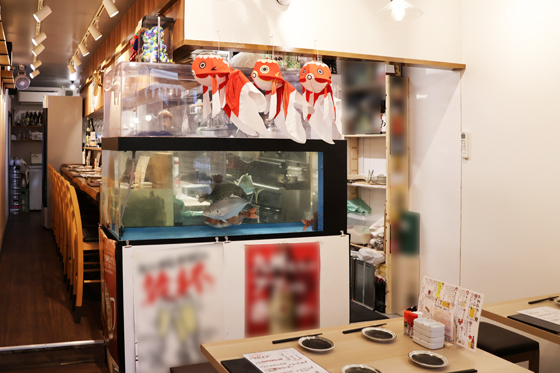 また、柳井金魚ちょうちんが飾られていたり、大きな生簀の中では魚が泳いでいます。