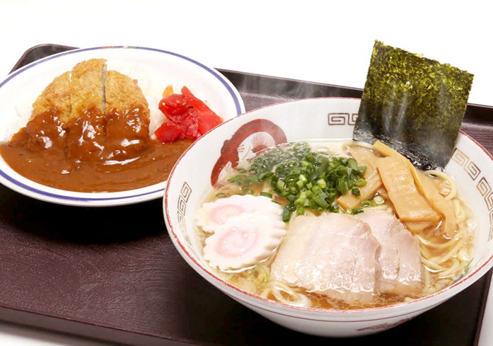 ※ご当地牛骨ラーメンと飛び魚のすり身で出来た“あごカツ”がのった自家製ミニカレーのセットメニュ―。