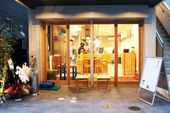 ビルの1階にあり、ガラス張りの外観から見える店内は、木目を基調としたカフェのような内装で、大きなカウンターと奥にはテーブル席もあります。