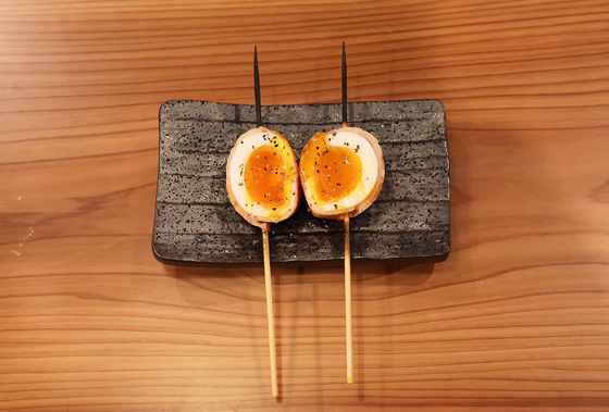 シンプルに半熟卵をベーコンで巻いて焼き、半分にカットして出てきます。