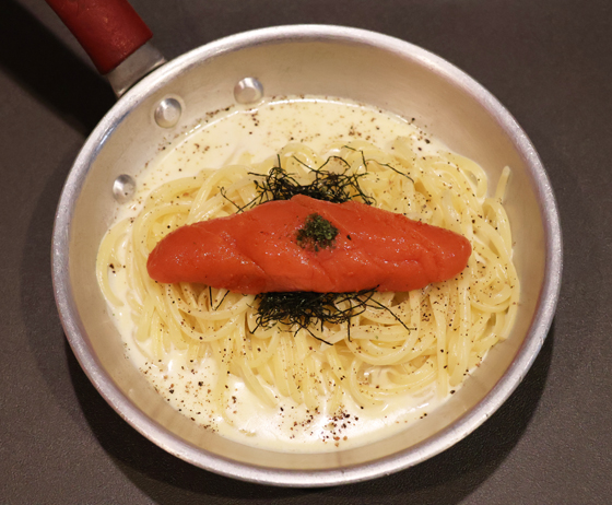 生パスタにトロリとした濃厚クリームが絡み、ふくやの一本物の明太子がのっています。明太子好きにはたまらない一品です。