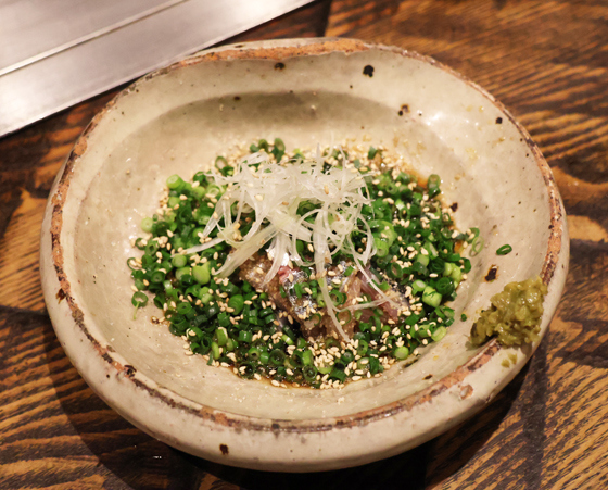 アジの刺身にたっぷりの葱とタレをかけた一品。オニオンスライスと柚子胡椒を添えているので、お好みで。