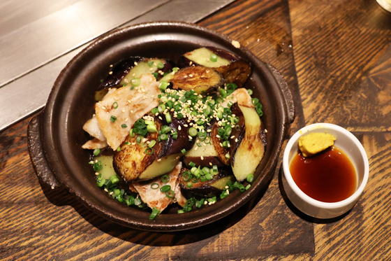 鉄板でソテーした茄子と豚に、たっぷりの胡麻と葱を振り、芥子付きポン酢を添えて出てくるので、お好みで。油を吸った茄子と豚肉の相性が抜群で、芥子ポン酢に漬けて食べると、さっぱりとした後口になります。