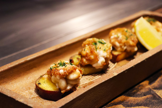タラの白子の周りにパン粉とチーズを付けて揚げ焼きし、ソテーしたサツマイモの上にのせて出てきます。トロリとした白子にチーズの香ばしさ、サツマイモの甘さが合います。