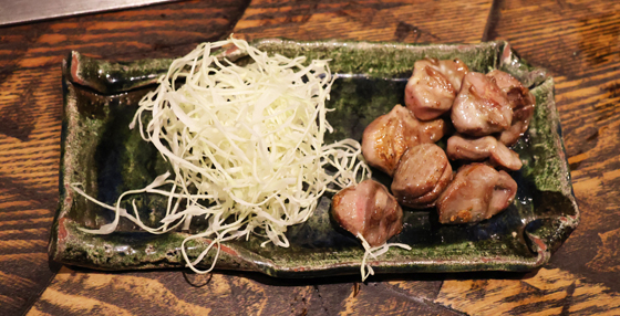 シンプルに砂ズリをソテーしたもの。千切りキャベツを添えています。