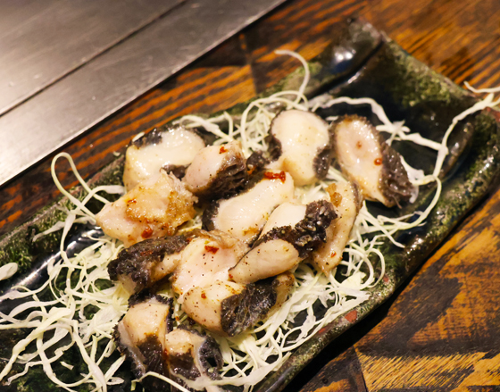 牛の第2胃袋「ハチノス」と第3胃袋「センマイ」の間にあるこぶ状の「ヤン」という希少部位を使った一品。バターでソテーして出てきます。まるで鮑のような食感です。