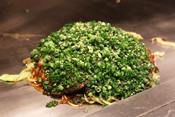たっぷりのキャベツを使った一品。広島のお好み焼きなので、たっぷりの葱と麺も特徴です。少し甘めのタレが焼けた香ばしさもよく、最後の締めや、途中のおつまみにもなるこの店の看板メニューです。