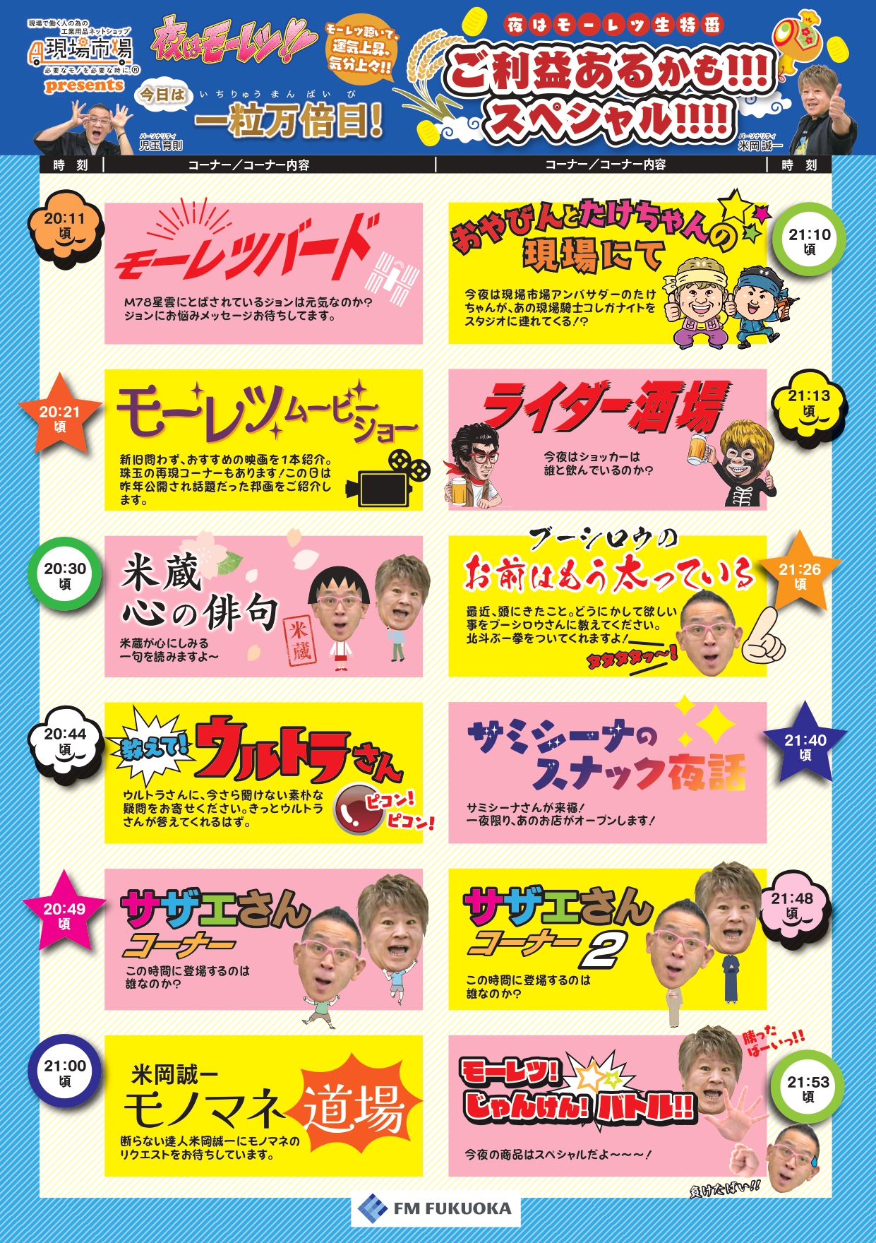 各コーナーへ、みなさんの悩み事、おすすめのグルメ情報、素朴な疑問、最近腹が立った事、あなたの周りの困った人、そして似てないモノマネの達人米岡誠一へのモノマネリクエストなどなど。